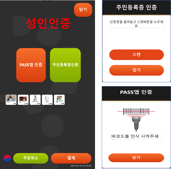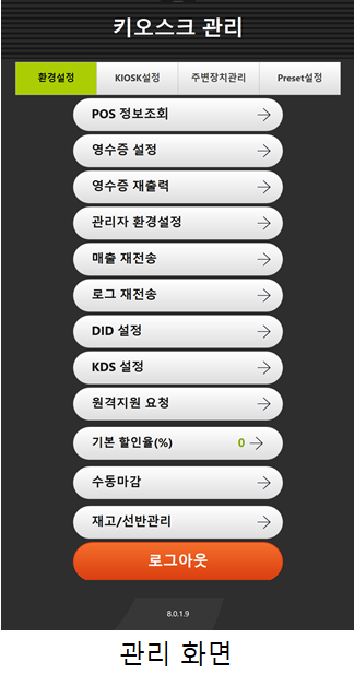 - 관리: 기기 설정, 주변장치, 재고관리, 할인관리