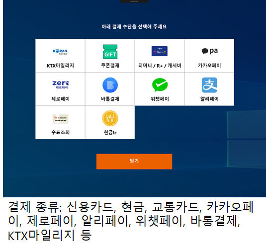 - 결제: 신용카드, 현금, 교통카드, 카카오페이, 제로페이, 알리페이, 위챗페이, 바통결제, KTX마일리지 등