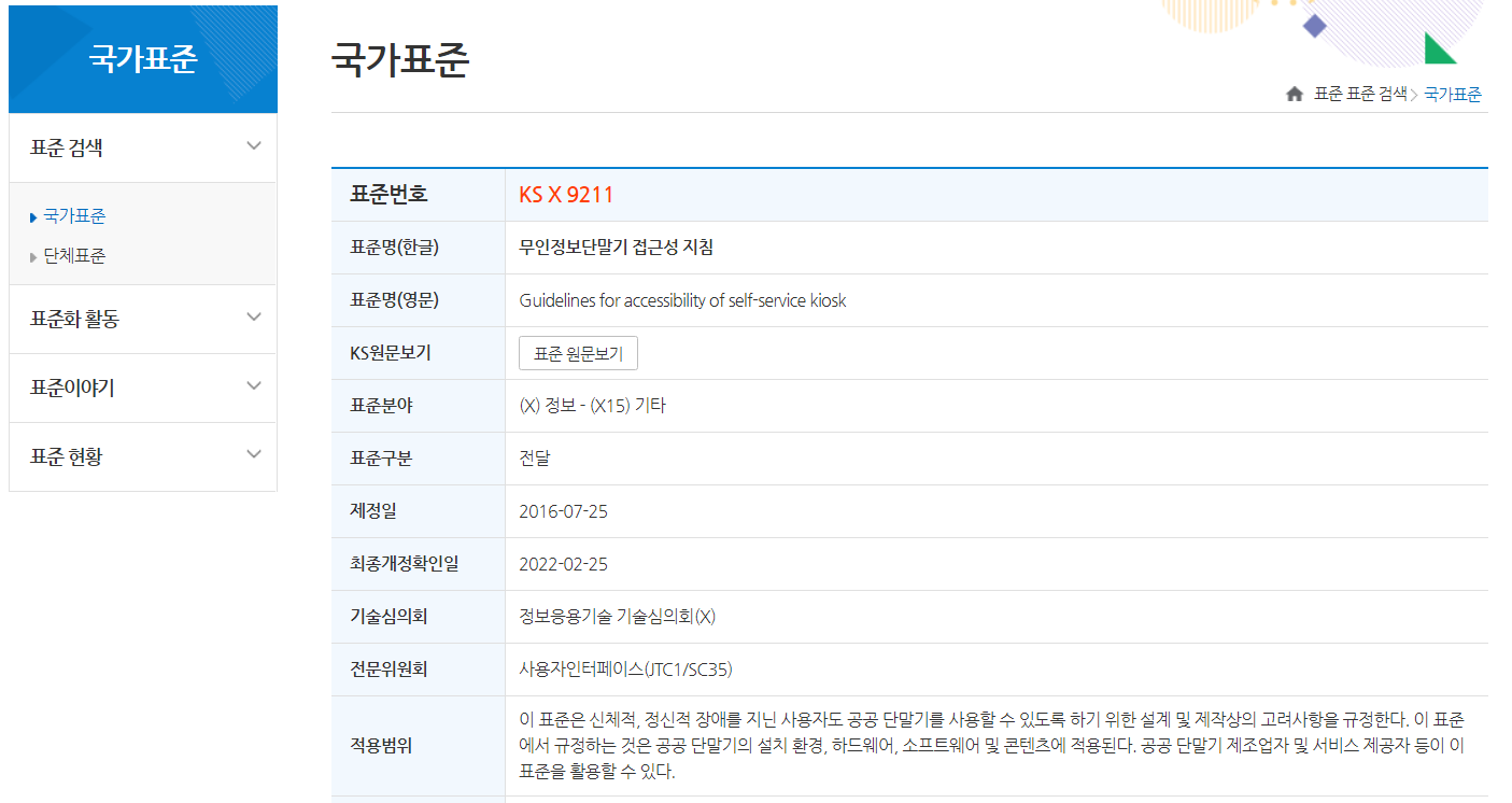 | 고령층 친화 디지털 접근성 표준(키오스크 적용가이드) (0) | 2022.02.17 |
