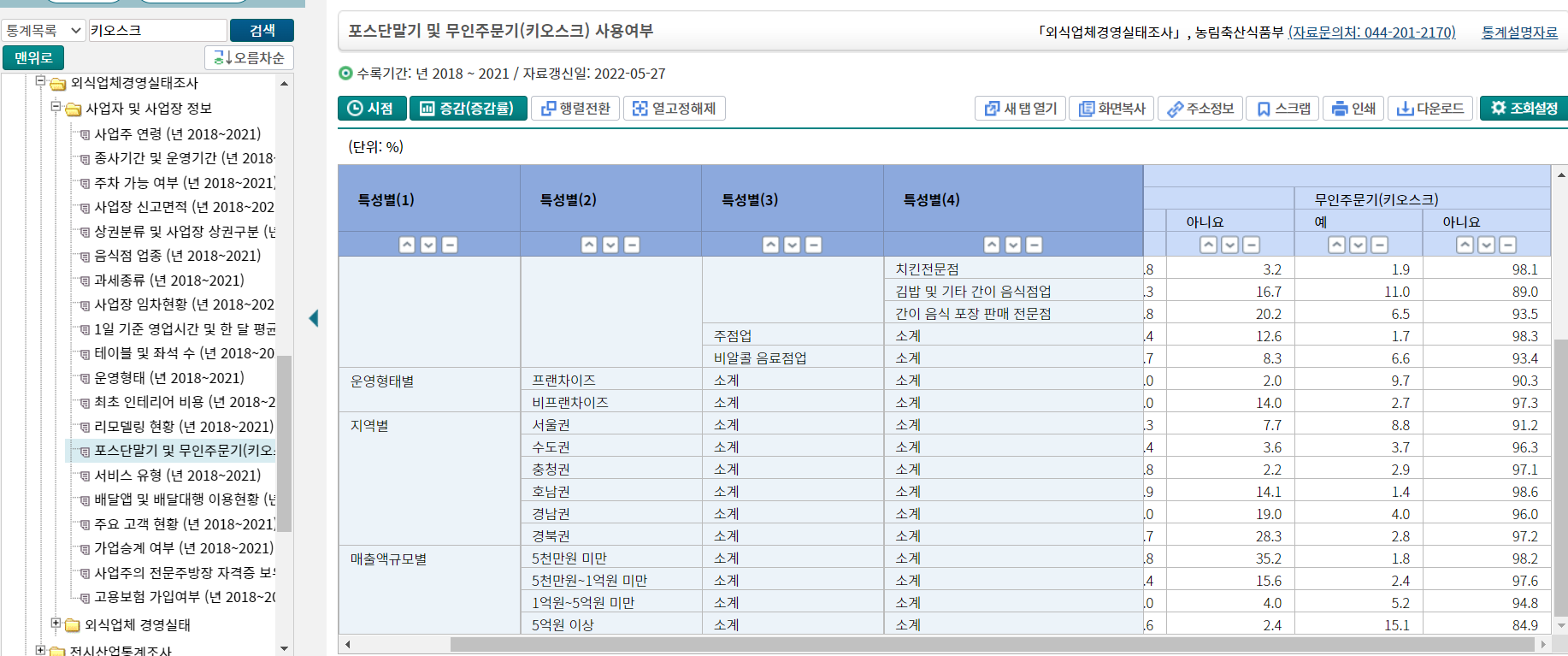 출처: 통계청 - 포스단말기 및 무인주문기(키오스크) 사용여부