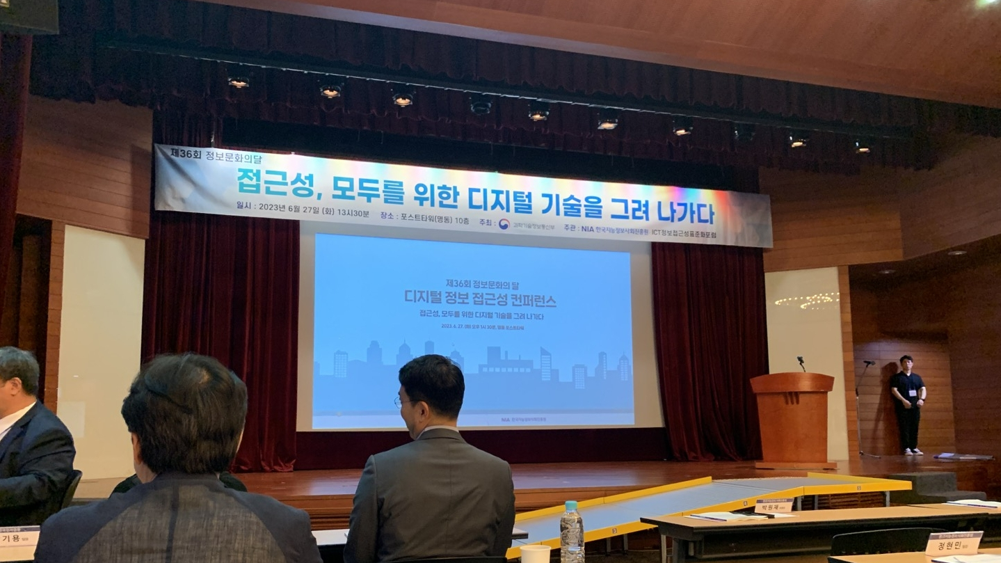 어제('23.6.27) 명동에 있는 포스트타워에서 '접근성, 모두를 위한 디지털 기술을 그려 나가다'라는 주제로 컨퍼런스가 열렸다. (보도자료 https://www.msit.go.kr/bbs/view.do?sCode=user&mPid=238&mId=113&bbsSeqNo=94&nttSeqNo=3183225)